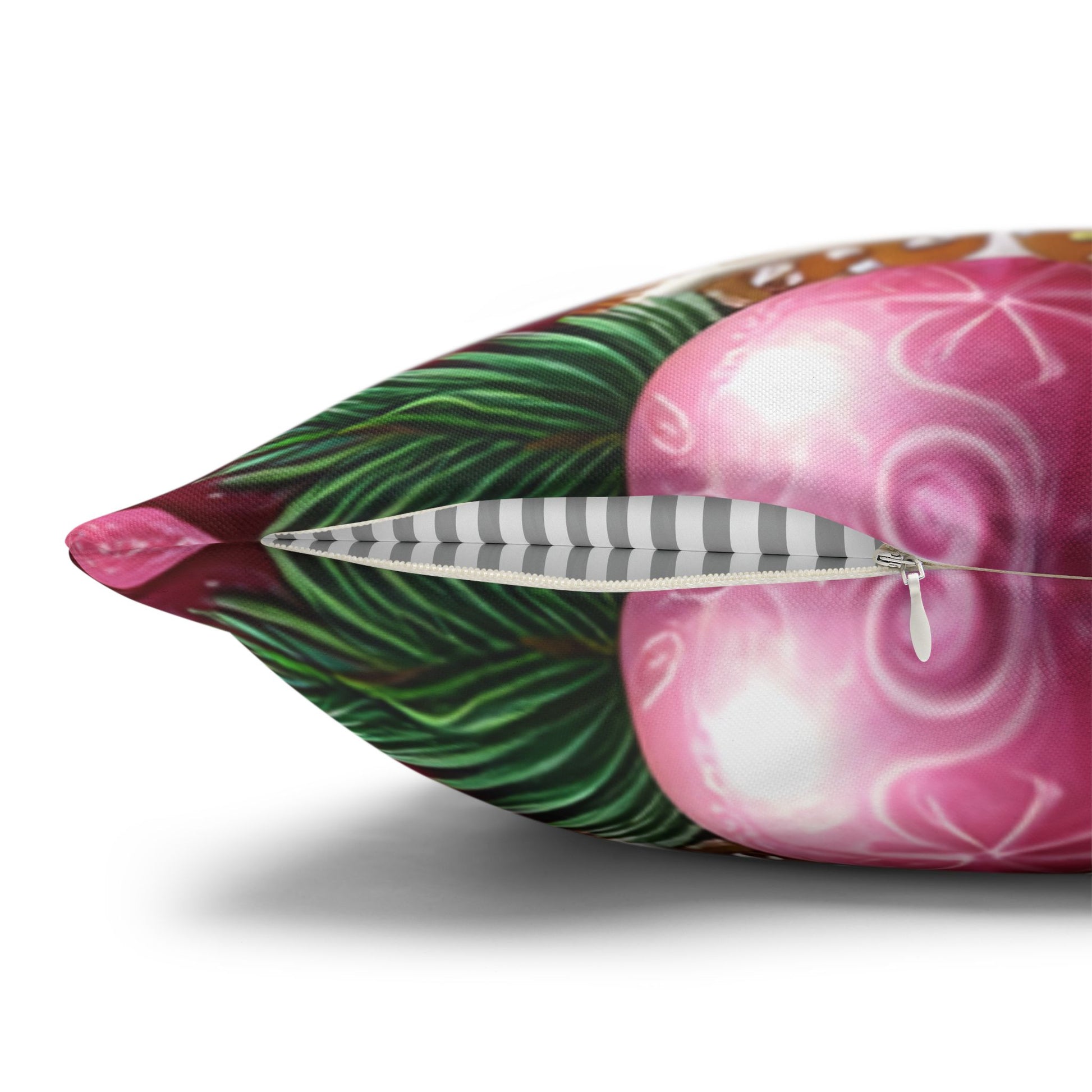 Cozy and whimsical, this square pillowcase brings sweet holiday charm to any room. Lush, double-sided printing captures a frothy hot cocoa mug surrounded by gingerbread, candy canes, and ribbons — colors are warm pinks, creams, and festive accents that feel like a holiday kitchen come to life. The spun polyester fabric stays smooth and vibrant without ironing, and the concealed beige zipper keeps the edges clean so the cheerful design remains the focal point. Slip it over an insert to add a playful, nostalgic touch to a mantel, reading nook, or kids’ room during seasonal gatherings and quiet winter evenings.