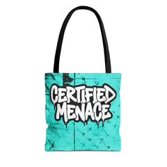 Certified Menace Turquoise Graphic Tote Bag | All Over Print Urban Grunge Streetwear Tote Bag