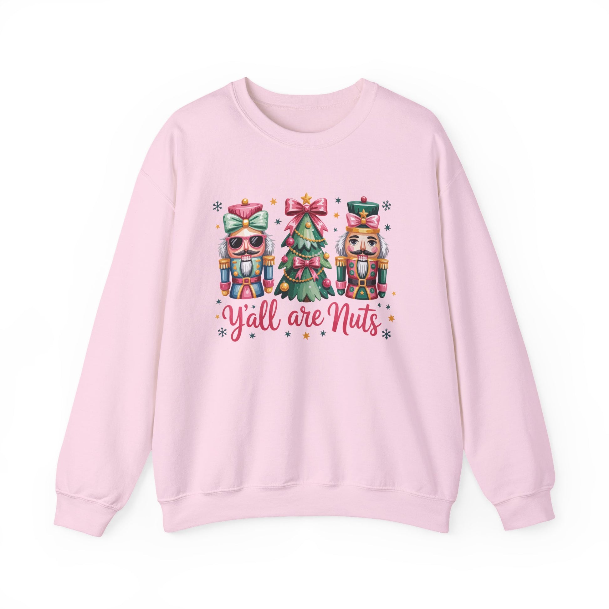 Embrace the festive spirit with this charming unisex crewneck sweatshirt. Adorned with whimsical illustrations of nutcrackers and the playful phrase "Y'all are Nuts," it radiates joy and warmth, making it the perfect addition to your holiday wardrobe. This sweatshirt offers a soft feel and comfortable fit, perfect for cozying up by the fire or attending holiday parties. Ideal for both men and women, it caters to those who love to spread cheer and celebrate the season with a touch of humor. Great for Christmas gatherings, family photos, or simply as a thoughtful gift, this sweatshirt captures the essence of joyous celebrations.