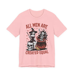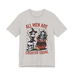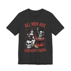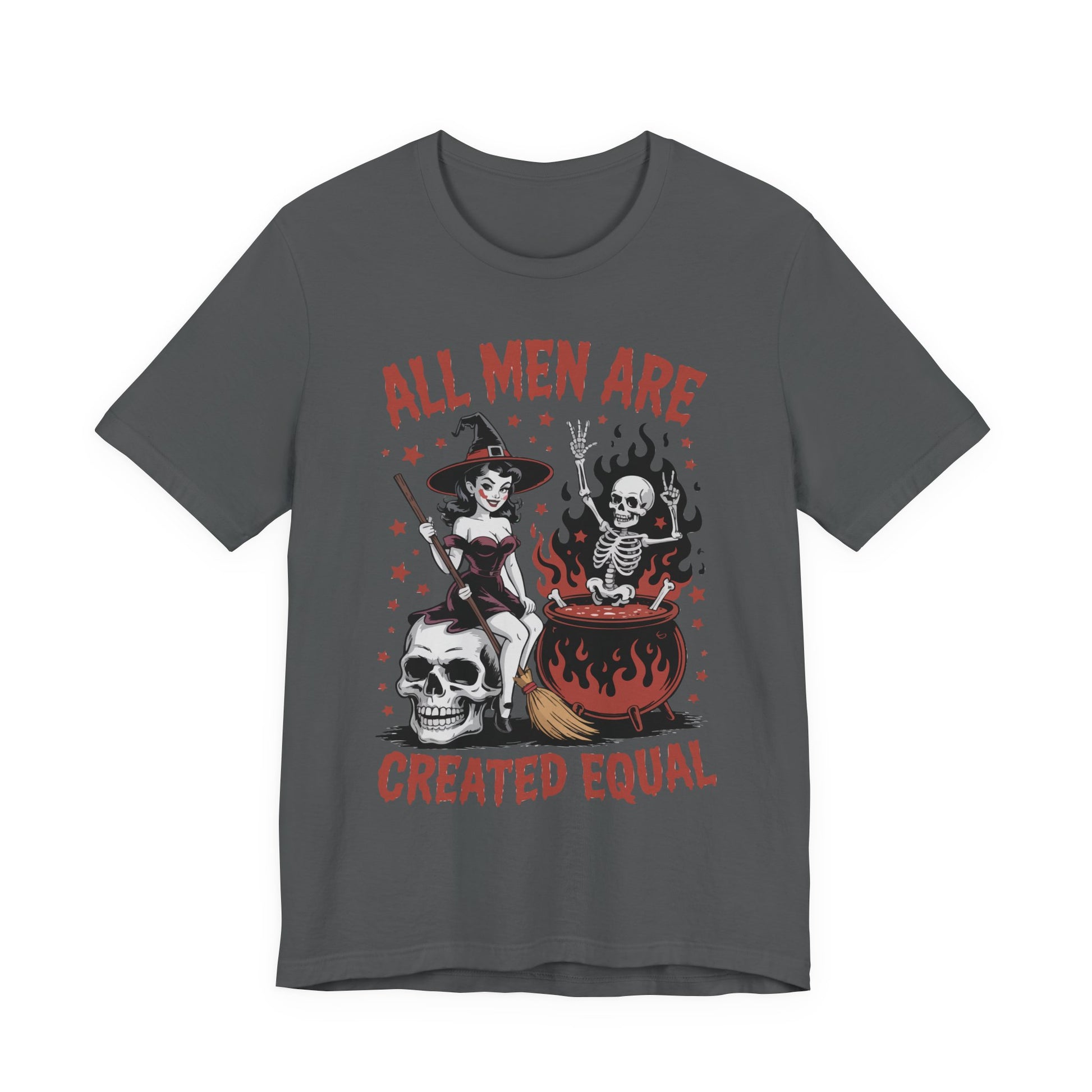 "All Men Are Created Equal" Witchy Graphic Tee | Unisex Short Sleeve T-Shirt with Skeletons, Unisex Casual Wear, Spooky Party T-Shirt, Pumpkin Spice Apparel, Unique Gift Idea